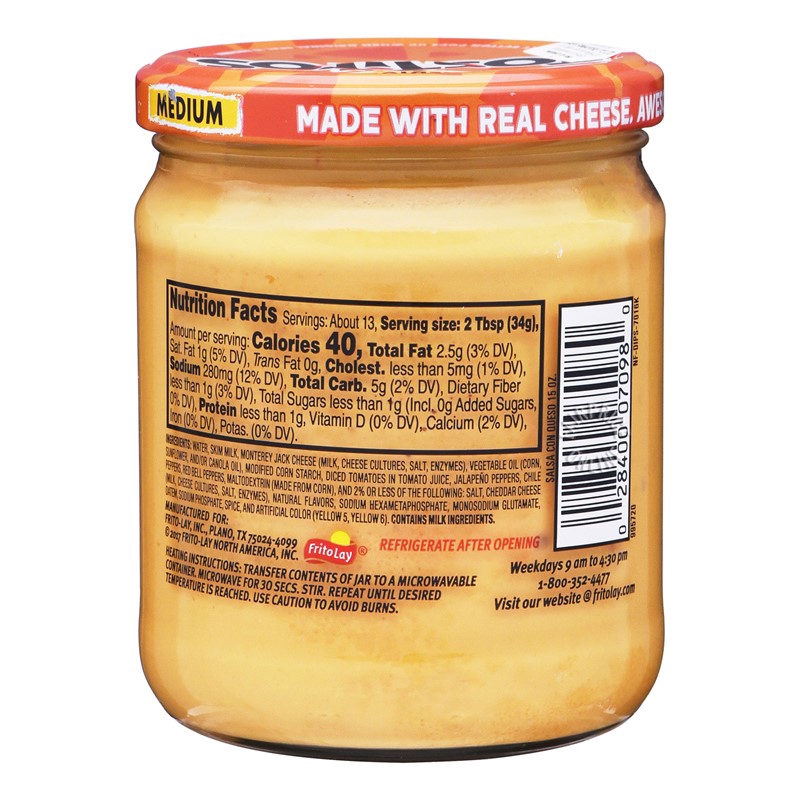 Tostitos Salsa, Medium Chunky Salsa, 15.5 Oz. Jar - Walmart.com Product details. This Medium Tostitos Chunky Salsa is a tasty addition to your pantry. It is ideal for eating with tortilla chips, corn chips, meals and more. Made with ripe tomatoes, jalapenos, onions and garlic, this chunky salsa features a moderate heat level. It adds a flavorful kick to snacks, recipes and much more. Each jar measures 15.5 oz. Dip, medium, salsa con queso, TOSTITOS nutrition facts and analysis. The latter is 0.4 g sugar and 0.2 g of dietary fiber, the rest is complex carbohydrate. Dip, medium, salsa con queso, TOSTITOS contains 0.7 g of saturated fat and 2.7 mg of cholesterol per serving. 30 g of Dip, medium, salsa con queso, TOSTITOS contains IU vitamin A, 0.2 mg of vitamin C and mcg of vitamin D as well as 0.04 mg of iron, 27.00 mg ... TOSTITOS® Avocado Salsa | FritoLay TOSTITOS ® Avocado Salsa is thick and creamy & made with real avocados. Perfect for parties, TOSTITOS ® Avocado Salsa is the perfect dip to enjoy with friends. Try with new TOSTITOS ® Strips tortilla chips! Buy Online. Nutrition Facts. Related Products.